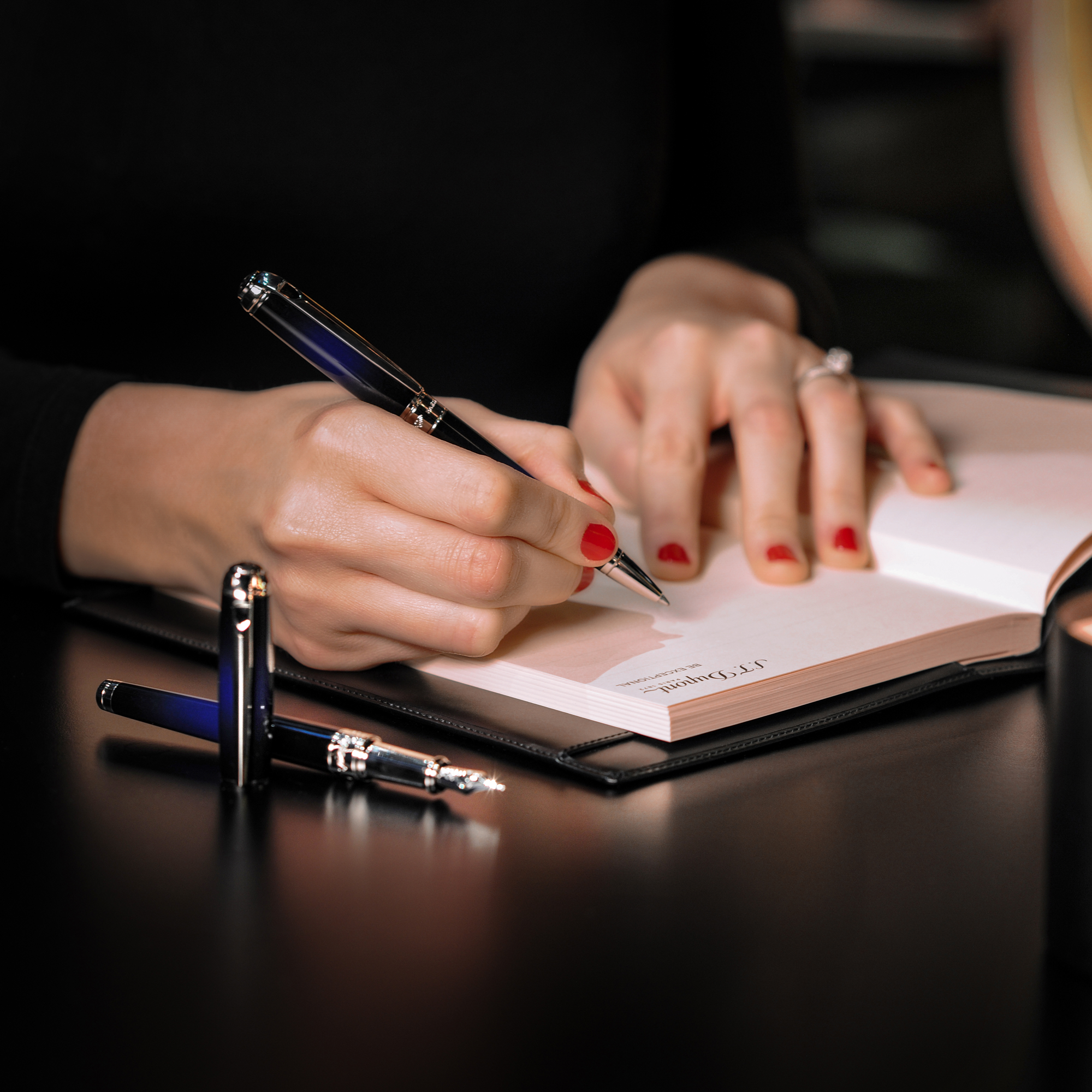 Large size Atelier Line D Ball point pen made with blue natural lacquer and palladium finish. The art of “Popoté”, an age-old technique producing a hand patina effect. The product is 100% hand crafted in France with precious materials. Available in large size ball point, roller ball and Fountain Pen.