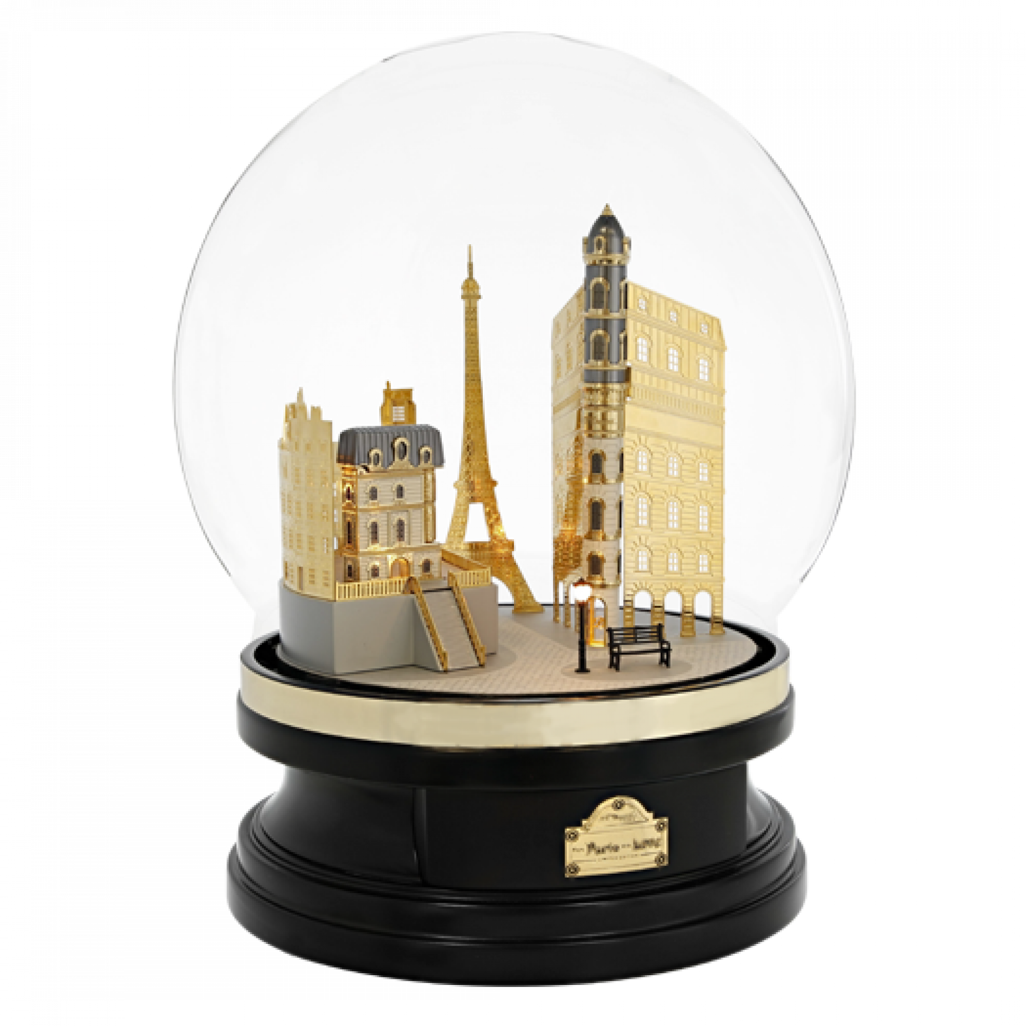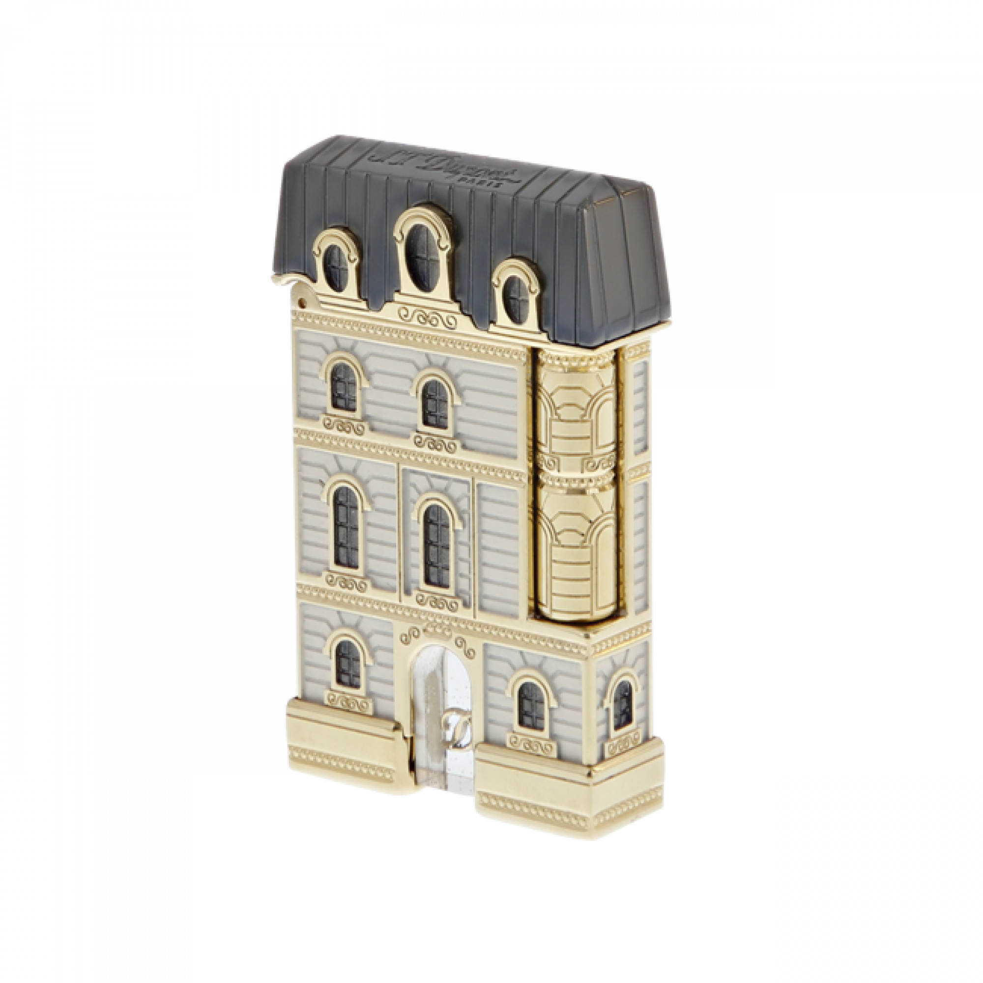 Fountain pen and Line 2 lighter with Ceramium A.C.T, natural lacquer with “Pierre de Paris” effect, grey natural lacquer, and yellow gold finish. Engraved nib set and engraved trigger. Roller bloc. Transparent part with glitter dust and the “D”. Glass globe and black wood stand, with 4 LED lights and metal building decor. Removable Eiffel Tower bookmark.