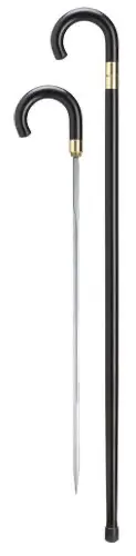 Crook-shaped handle cane with a 23″ long stainless steel blade concealed in the scorched wood shaft with cherry, burgundy, or black stain finish with brass accents. Made in the USA.