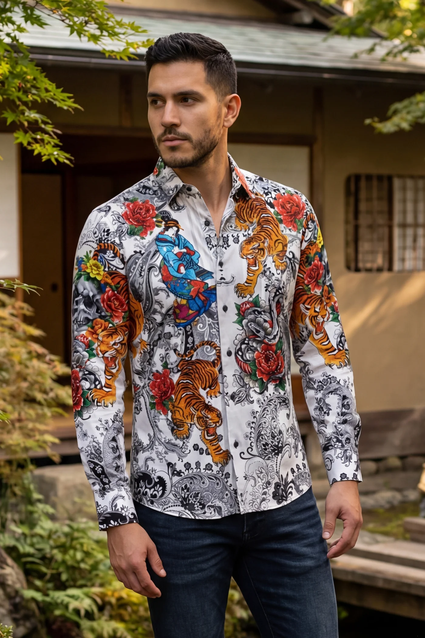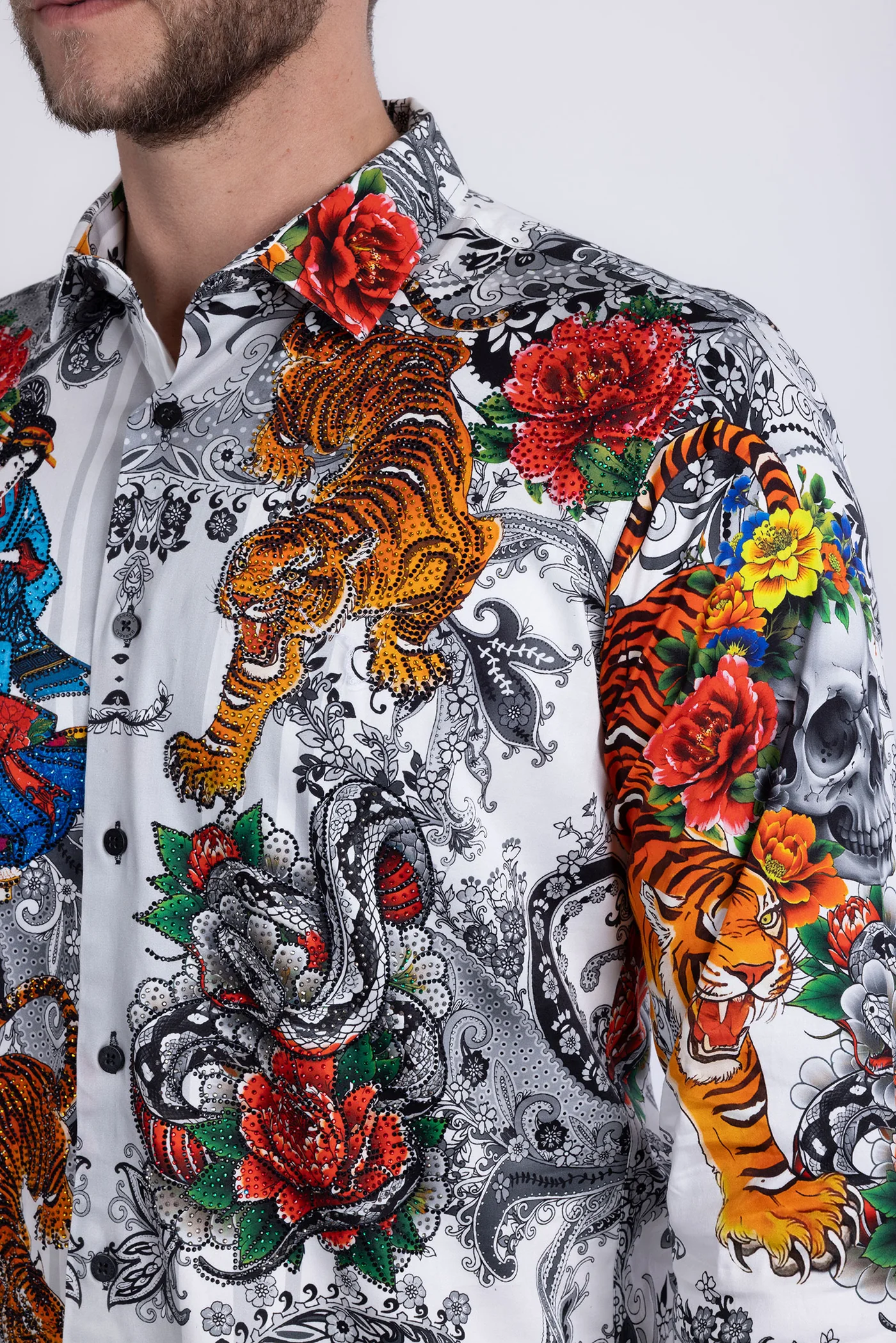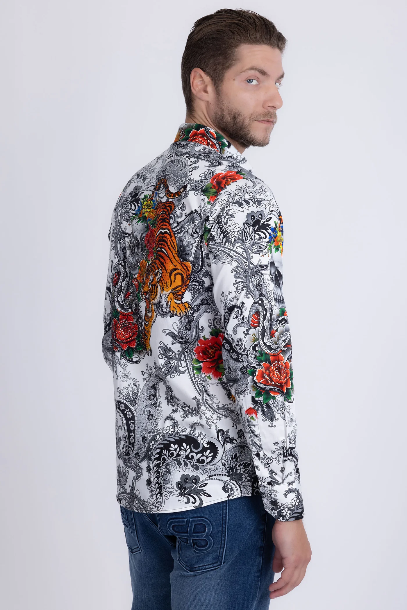 Discover refined elegance with this Cranium men’s long sleeve shirt, featuring an intricate rhinestone-embellished design that blends floral and animal artistry. Crafted from premium lightweight stretch fabric, it delivers both comfort and visual impact for the modern man who values quality craftsmanship and distinctive style. A signature Barabas piece that commands attention without compromise.