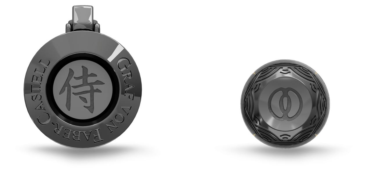 - The end cap is adorned with the symbol tsuba (hand guard), designed by Miyamoto Musashi and a wave-like pattern