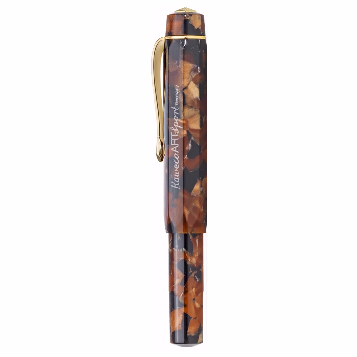Kaweco ART Sport Fountain Pen in Hickory Brown. The ART Sport closely follows an original 1935 octagonal design – ‘Small in the pocket, large in the hand’. The oversized cap arrangement creates a small closed pen but a full-length open pen. Closed, the pen is just 108mm long, open 133mm long. The barrel is 14mm in diameter (around the cap).