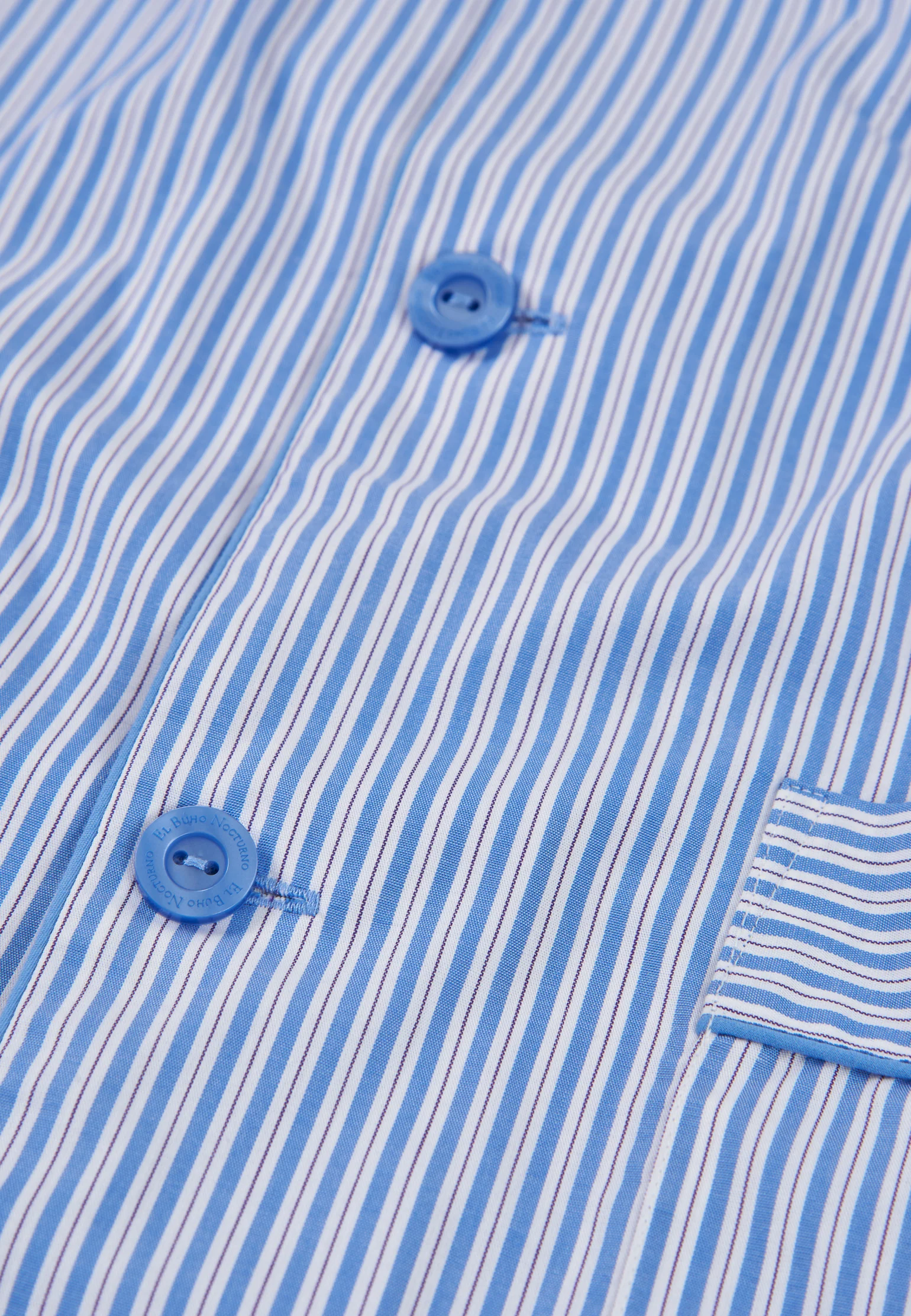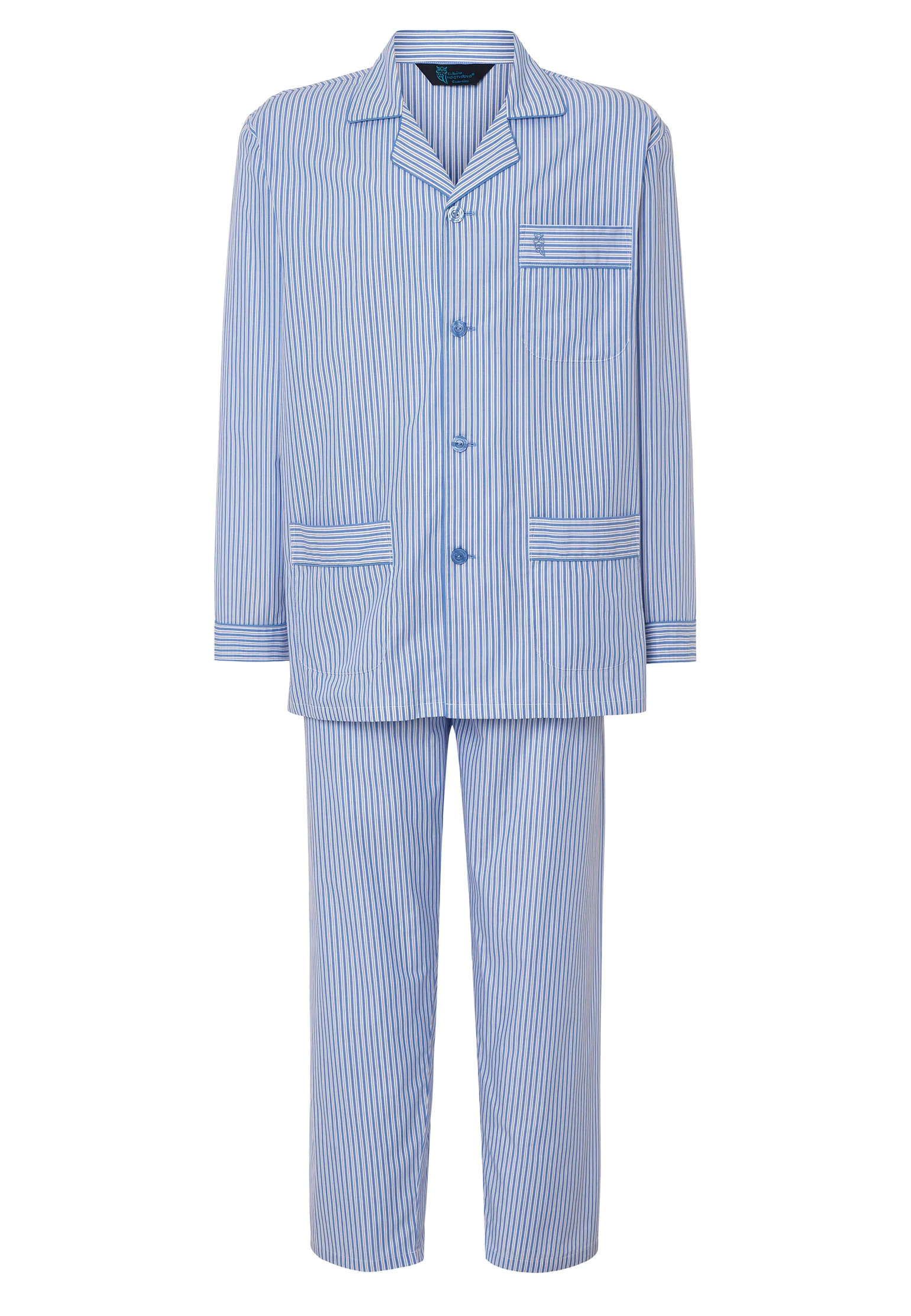 Men’s long classic mid-season pajama set in royal blue and purple stripes. Part of the Essentials collection, made from 100 percent cotton poplin for softness, strong color definition, and durability. Regular fit with equal width in sleeves and pant legs for a loose, comfortable, and polished look.