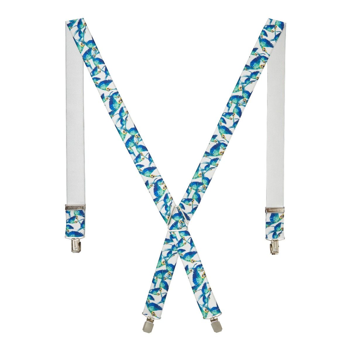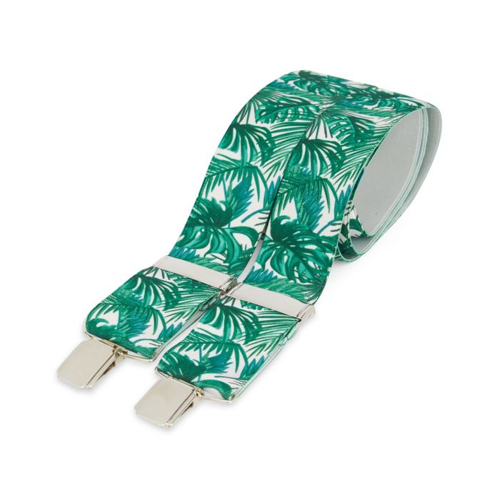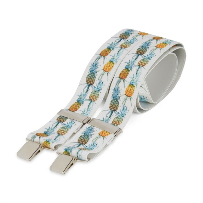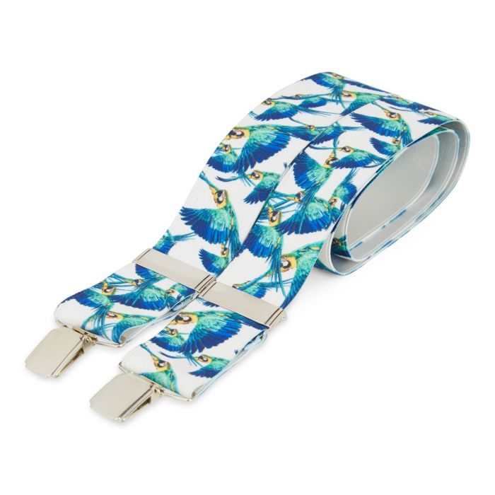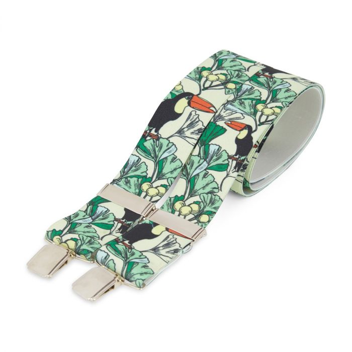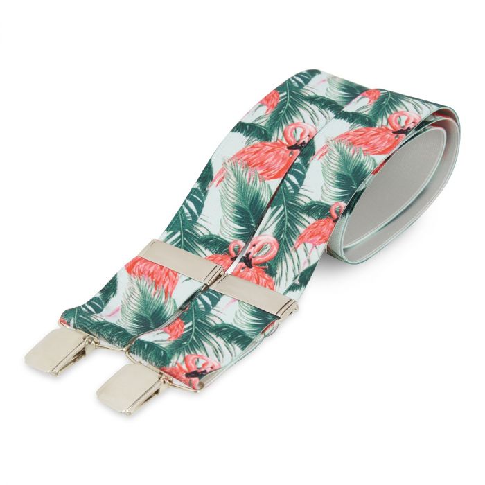 Our Paradise braces collection is handmade in England, featuring 4-clip fastenings with metal backs. 35mm width elastic. Available in five tropical-inspired prints; Flamingo, Palm Tree, Pineapple, Parrot and Toucan.