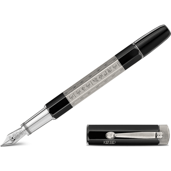 The Montblanc reinterpretes the writing instrument featuring a longer, slimmer silhouette and craftsmanship refined over generations. With its octagonal shape, this writing instrument is reminiscent of the octagonal-shaped writing instruments designed by Montblanc in the 1920’s, which included Egyptian-style engravings: so-called “Egyptian pens”. Created in black precious resin and metal, it features “Montblanc” on the barrel in Egyptian hieroglyphics, and a scarab beetle on the clip.