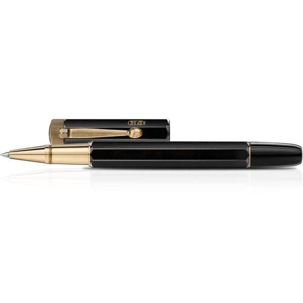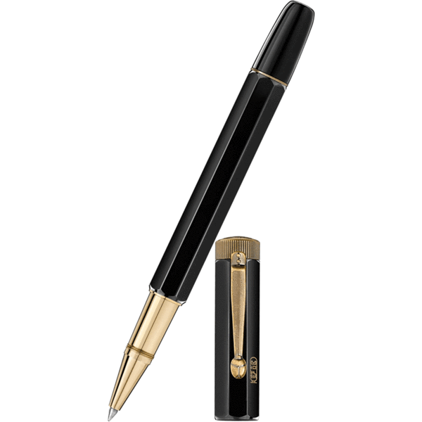 The Montblanc reinterpretes the writing instrument featuring a longer, slimmer silhouette and craftsmanship refined over generations. With its octagonal shape, this writing instrument is reminiscent of the octagonal-shaped writing instruments designed by Montblanc in the 1920’s, which included Egyptian-style engravings: so-called “Egyptian pens”. Created in black precious resin and metal, it features “Montblanc” on the barrel in lacquer hieroglyphics, and a scarab beetle on the clip.