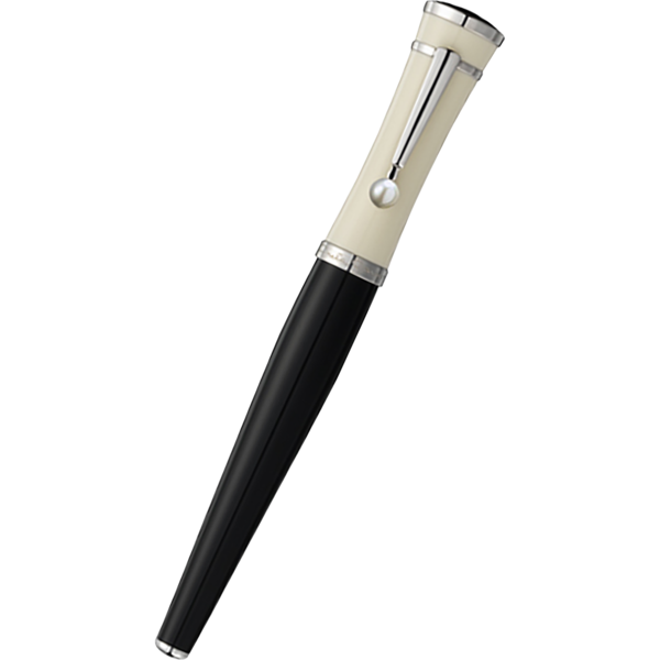 The extraordinary design with a black barrel, a cream colored cap, both made of precious resin, with a beautiful shape and a clip which is set with a white, round Akoya pearl.