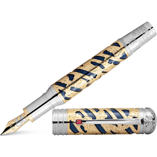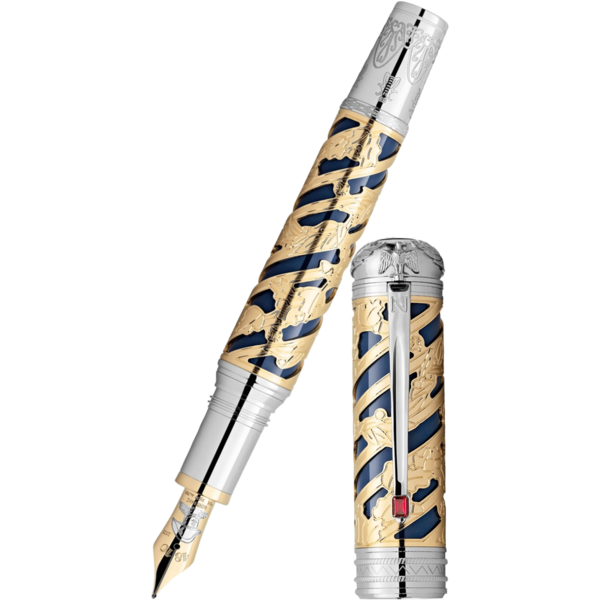 | Special Features | Clip:Platinum-coated clip end decorated with red garnet recalling coronation ring of Napoléon Bonaparte’s wife Joséphine and Sword-shaped platinum-coated clip bears Napoléonic “N” as displayed on Napoléon Bonaparte’s throne in Fontainebleau Design:Au 750 solid yellow gold skeleton overlay with intertwining oak and olive leaves drawn from Napoléon Bonapartes uniforms, Merovingian bees refer to décor in his imperial palaces, Blue lacquer underneath Au 750 solid yellow gold overlay inspired by colour of Napoléon Bonaparte’s uniform. Also the engraving of emperor’s portrait on platinum-coated cone featuring Egyptian palmette and bees engraved on cone Cap:Montblanc emblem in mother-of pearl on cap top. The platinum-coated cap top engraved with laurel wreath, imperial crown and eagle referring to Napoléon Bonaparte’s coronation insignia Fittings: Decorative gold-coated fittings and detailed work on cap ring inspired by classical style of Napoléon Bonaparte’s buildings. Nib:Handcrafted bicolor Au 750 solid yellow gold nib bears portrait of Napoléon Bonaparte with typical bicorn hat |