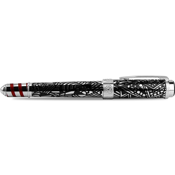 The Montblanc Patron of Art writing instrument features linear design of clip and cap, as well as the lines and shapes of black lacquer inlays in the platinum-coated cap and barrel, are inspired by Art Deco works from her collection.