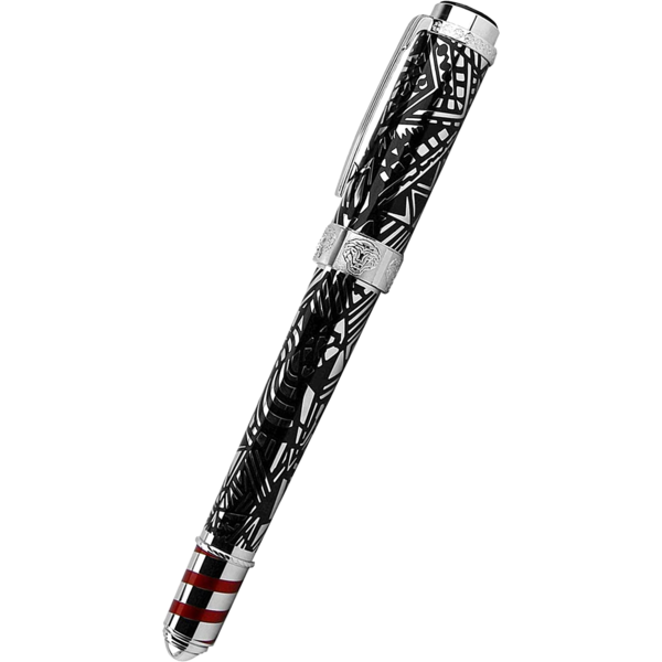 The red lacquer inlay spiral on the cone represents the striped mooring poles lining Venetian waterways. The lion’s heads embossed on the cap ring refer to Peggy Guggenheim’s Venetian palace, the Palazzo Venier dei Leoni, as well as the lion of Saint Mark, the symbol of Venice.