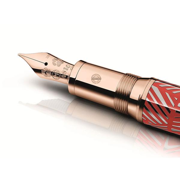 Montblanc 2016 Patron of Art honors Peggy Guggenheim, a devotee of modern art with a fountain pen. Peggy Guggenheim is one of the most significant art collectors and exhibitors of 20th century; she dedicated most of her life caring the art of Venice museum. An art lover and promoter, she was devoted to her work.Montblanc Peggy Guggenheim 888 Patron of Art Limited Edition Fountain Pen is an extraordinary writing instrument with the engravings of lion heads on the red gold cap ring which is inspired by the exterior of the ‘palazzo venier dei leoni’, Peggy’s home. The cap ring is embroidered with 10 garnets in the eyes of the lions. The cone designed like the red and white striped mooring pillars in red gold and translucent red lacquer featuring a brilliant cut diamond rind at its end. And like other Montblanc pens, the Monblanc symbol in white marble crowns the writing instrument. The nib is engraved with the paws made of Au750 solid gold which is symbol of her affection for 14 lhasa apso dogs