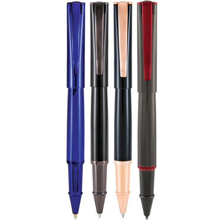 The modern design starts at the top of the cap with a perfect square which then effortlessly transitions into the round barrel. The sleek clip also starts at the top of the cap with a spring action that makes for smooth placement and removal from the pocket. The classic Black is available with either Chrome Trim or Rose Gold Trim. The Gun Metal has striking metallic red trim and the Pearl Silver is paired with a metallic blue. Mode choices are Ballpoint, Rollerball or Fountain Pen with a large flexible nib either in Fine, Medium, Broad or Stub.