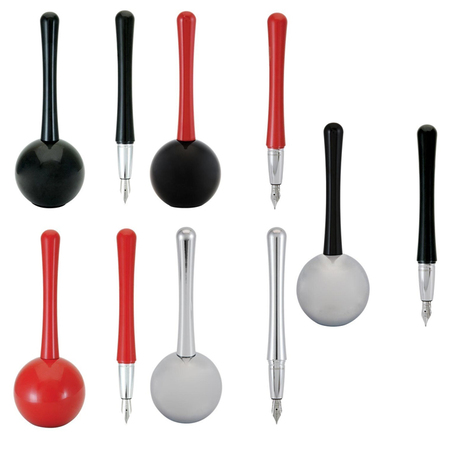 Never be caught rifling through drawers and pockets for a pen again! The Luna Desk pen stands tall and proud, ready to write at a moments notice. Made from solid brass, the heavy weight base will stay put and keep your pen handy at all times. Luna is available in two smooth writing modes: A fluid rollerball or fountain pen available in 5-point sizes! (EF, F, M, B, 1.1 Stub) The fountain pen fills via standard cartridge/converter and the rollerball fills with standard G2 refills. Choose red or black polished lacquer. Presented in luxurious gift box.
