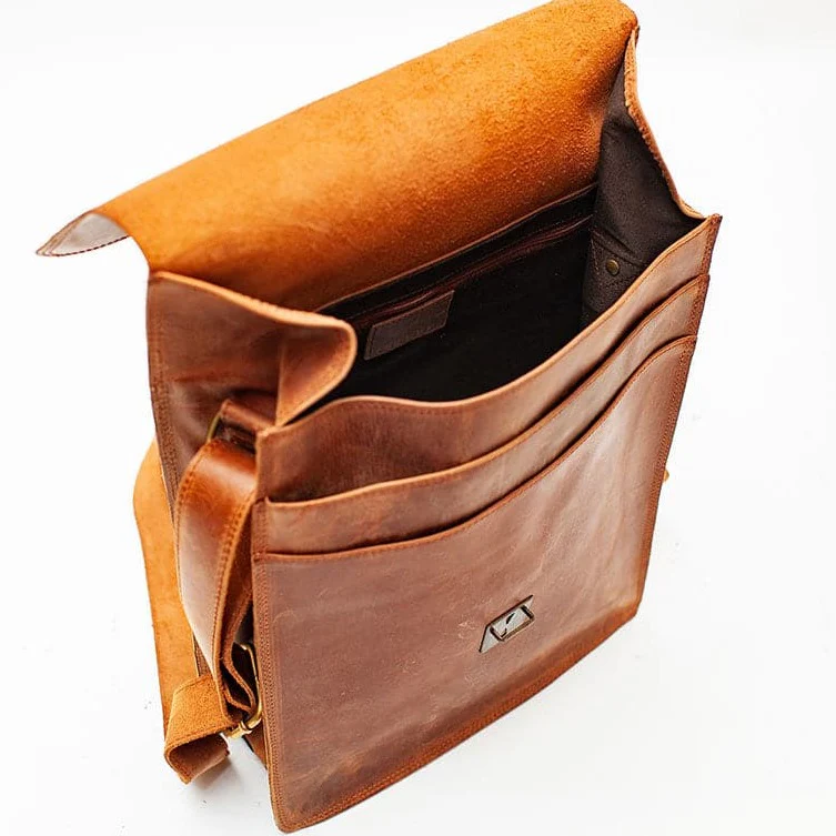 If you fancy the look of a classic postman bag, the Montreal Leather Satchel in Saddle Brown is for you. This rectangular bag boasts a timeless design inspired by traditional English courier bags, crafted from vegetable-tanned, full-grain leather for durability and character. It features a vertical orientation, vintage-style buckle strap with a hidden push-lock closure, and polished Italian brass hardware. Available in two sizes, the large option comfortably fits an iPad or a slim 14-inch laptop along with your daily essentials.