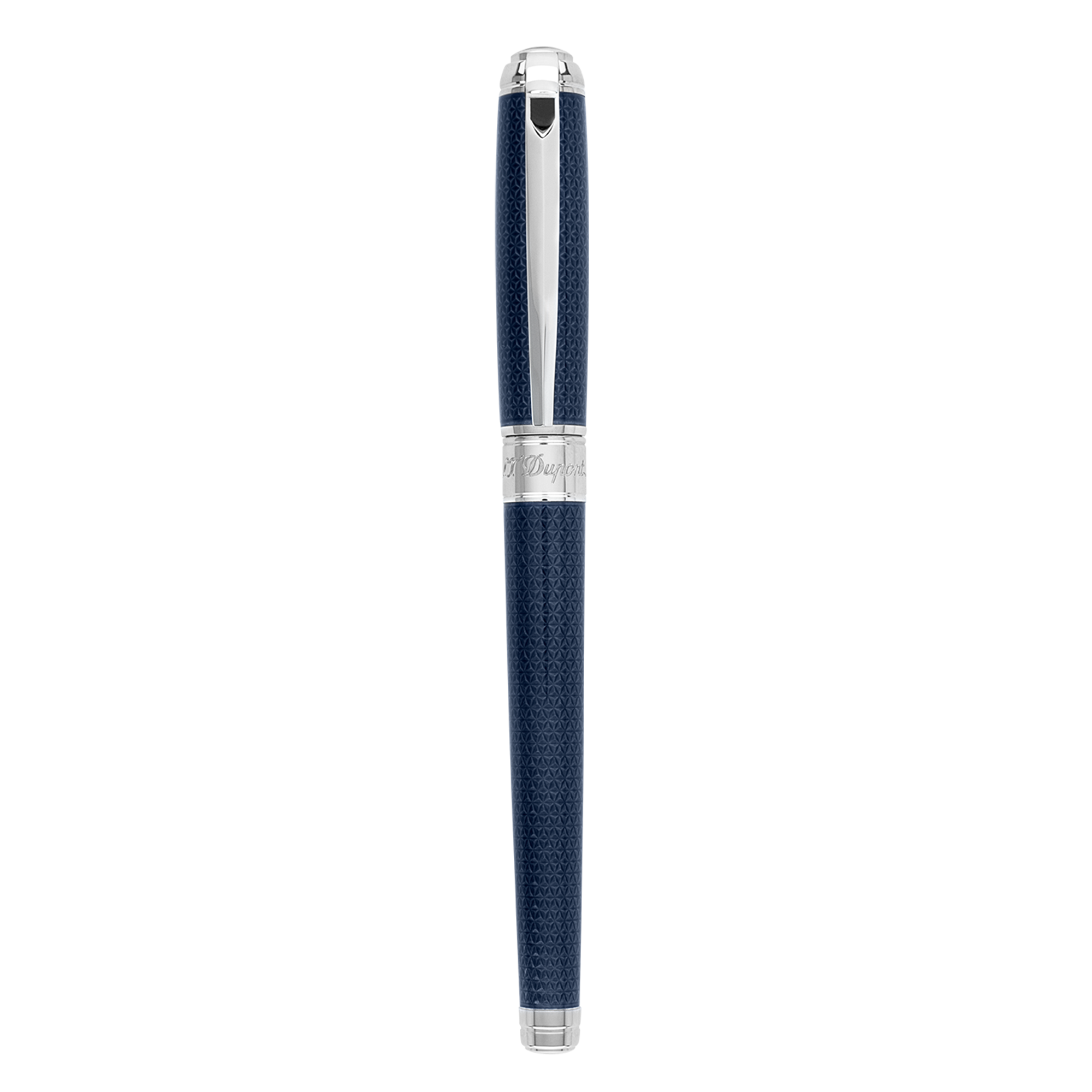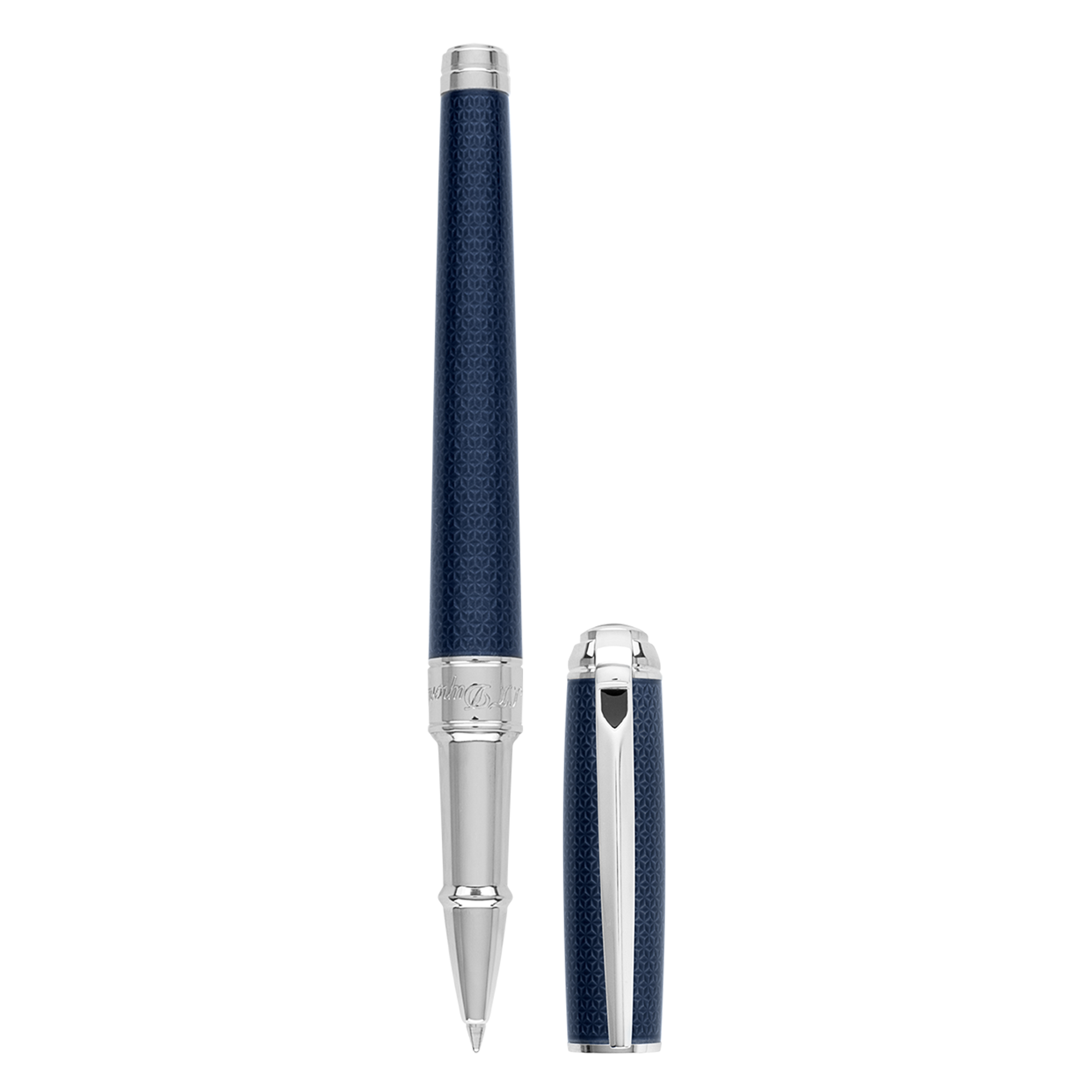 Medium size Line D roller pen made with blue natural lacquer and palladium finish. New top with a beautiful loop effect highlighting the ‘D’ in metal New curved and articulated clip perfectly integrated to the top. The product is 100% hand crafted in France with precious materials Available in medium size ball point, roller ball and Fountain Pen.
